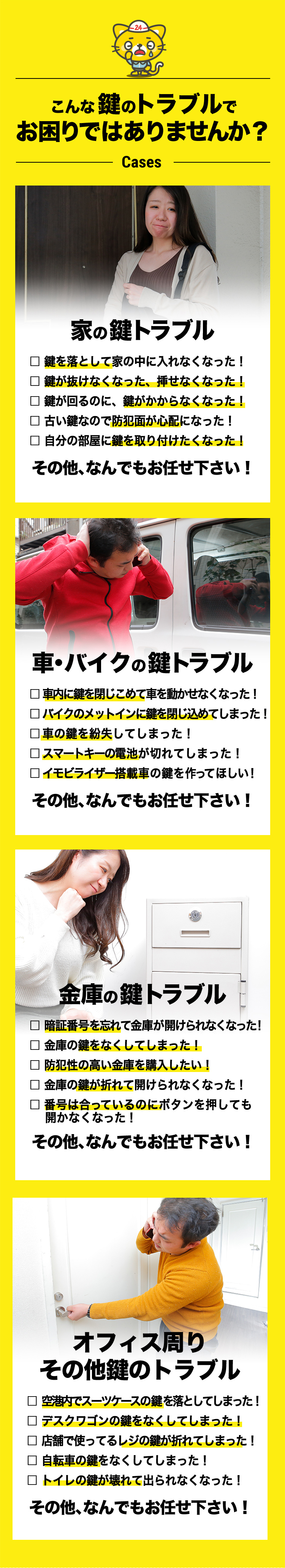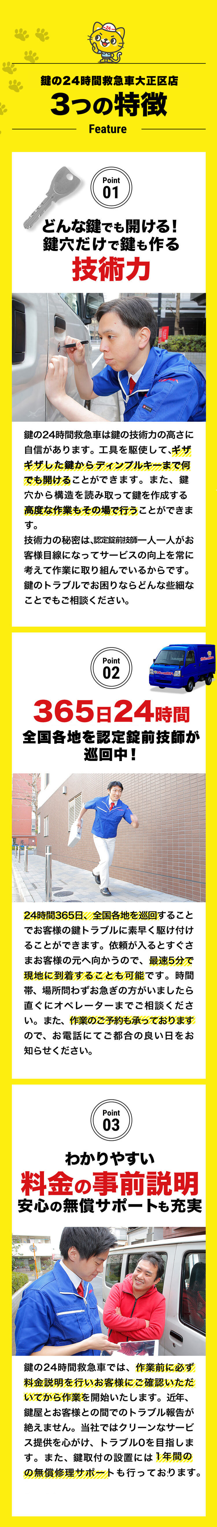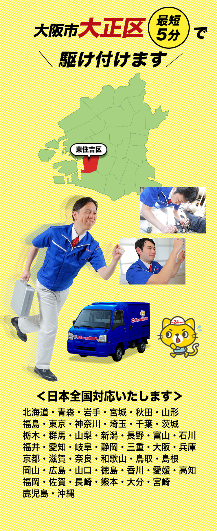 大正区で「カギの出張24時間」が提供する信頼の鍵サービス。常にお客様のニーズに応えるため、作業前の詳細な説明と安心価格で対応します。大正区で鍵の迅速な解決を求める方は、当店の親切丁寧なサービスを体験してください。